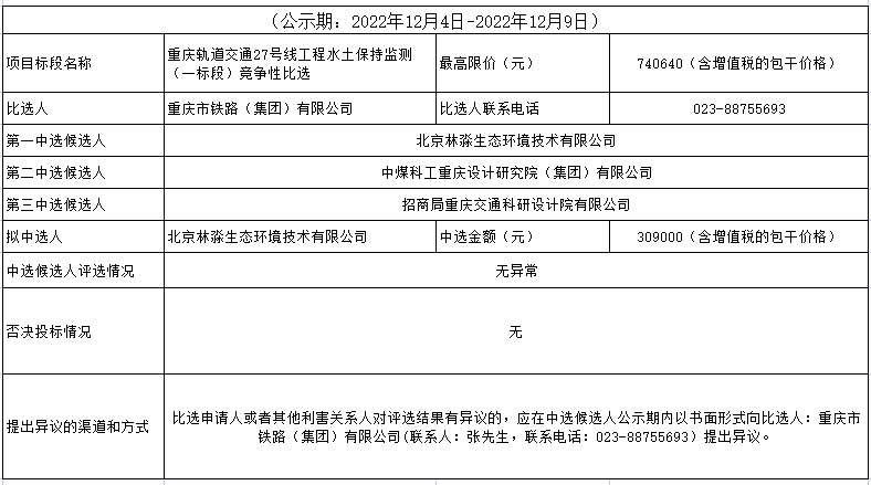 重慶軌道交通27號線工程水土保持監(jiān)測(一標(biāo)段)競爭性比選結(jié)果公示表