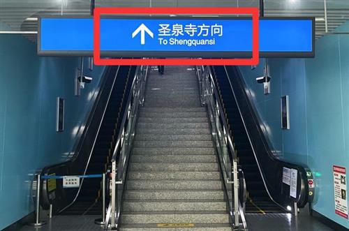 當我們在站廳搭乘扶梯上樓時,頂部會有一塊這樣的藍色標識,上面寫著某個站點的名字,代表從此側(cè)扶梯上去搭乘的就是往“XXX”方向的列車。